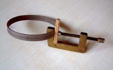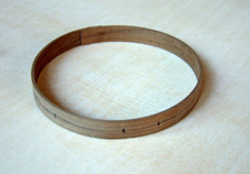 Therefore, for its realization we start from a modeling walnut wood strip of 1 cm in height (12 mm for the tambourine), and about 30 cm in length. After having drawn on graph paper the exact positioning of the holes for the insertion of the cymbals, that for the “handle”, and that of any embellishment holes or for the insertion of bells, we proceed to report these distances on the wood with the help of a fine-tipped permanent marker (photo 1). The terminal parts of the strip, for a length of 1 cm, are shelled in a “slope” and in the opposite direction to allow the two ends to be glued without a variation in thickness in this area which would lead to a possible deformation of the tammorra , then proceed to hot bending (photo 2). We will use for the purpose a “bending iron” for bowed instruments or even a very banal soldering iron. Probably, a “bender” of those used for hobby work is just fine, but I have no experience with this tool, so I will achieve the same goal with a more familiar tool. Once the iron has been brought to the desired temperature (the tool is equipped with a thermostat), i.e. the one capable of bending the strip in question without burning it, the strip is soaked in water for a few minutes, then the excess water is drained and is forced against one of the sharpest curves of hot iron with the help of a glove, after placing an aluminum sheet between the hand and the strip. In this way the strip will bend without problems and we can easily give it a 360 degree curve and glue the two ends with the help of a clamp (photo 3-4). The same curve will be given to another 2x1mm walnut strip which will serve as a “counterbeam”. If there are any imperfections in the curve of the strip, these can be easily corrected by rewetting the strip and forcing it around a bottle where it will be blocked with an elastic band for at least 24 hours. Once freed from the bottleneck, the two ends of the slat already shelled are glued with the aid of a clamp and, once the glue is dry, it is glued, to what will become the upper edge, the “counter-band” strip to increase the thickness of the gluing surface to the membrane with the help of adhesive tape or clamps (photo5-6). Once the glue is completely dry, the upper face is flattened by passing it on thin sandpaper spread on a flat surface, until the strip and counter-strip form a single surface. We then proceed to the drilling. For the “handle” we will use a 5 mm tip, a 4 mm tip for the cymbal holes, and a 3 mm tip for any embellishment holes. It is better to use “wood bits”; these, unlike the drills for drilling metals, which have a conical point, have a flat point but have, at the center of the cutting surface, a very small conical point which serves to maintain the drilling point in a stable way, that is, the tip it cannot deviate during its run. With a pencil, mark the center line so that the holes are exactly in the center of the strip and begin to drill the beginning and end of the “windows” (photo 7), then make intermediate holes, quite close together so to be able then with a cutter to eliminate the separation diaphragms and to rectify the surfaces with a file and then with sandpaper (photo 8-9). After the holes have been rectified, a coat of “sealer” is applied and when the paint is perfectly dry (2-4 hours) the holes are rectified and the surfaces are properly sanded with sandpaper or metal mesh.