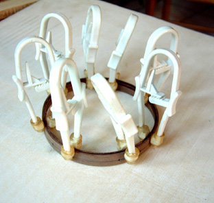 The last phase of construction involves the construction of the “cymbals” and their housing in the holes provided in the strip. The cymbals can be cut, with the help of a pair of scissors, from a normal thin sheet of iron (the one that can be obtained from cans of preserves is the most suitable for the purpose and the one that is still used today for popular tammorre. today). Once drilled in the center, the cymbals are placed in pairs in the holes and held in place with a thin wire. Fig. 10 illustrates the final result.